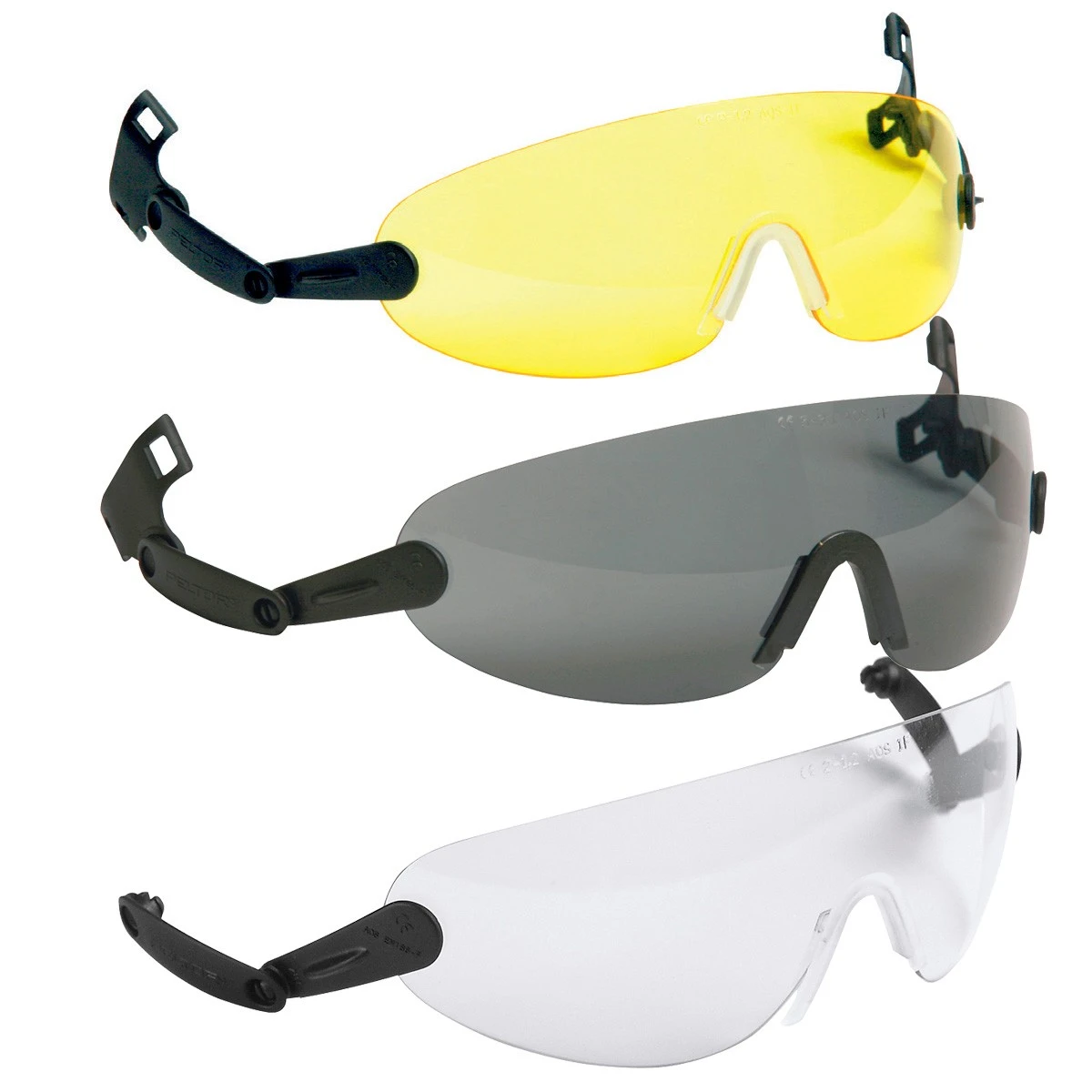 Peltor V9-sarjaan kypärään integroidut suojalasit on helppo kiinnittää. Muotoilunsa ansiosta lasit liukuvat helposti kypärän kuoren ja sisuksen väliin. Lasien sangoissa on useita niveliä, joiden avulla lasit voi säätää yksilöllisesti. Integroidut suojalasit asettuvat lähelle käyttäjän poskia antaen hyvän suojan pöly- ja muita hiukkasia vastaan. Hyväksytty standardin EN166 mukaisesti. Lasit on suojakäsitelty huurtumista ja naarmuuntumista vastaan. Voidaaan käyttää yhdessä verkkovisiirien kanssa. Materiaalipaksuus 2 mm.