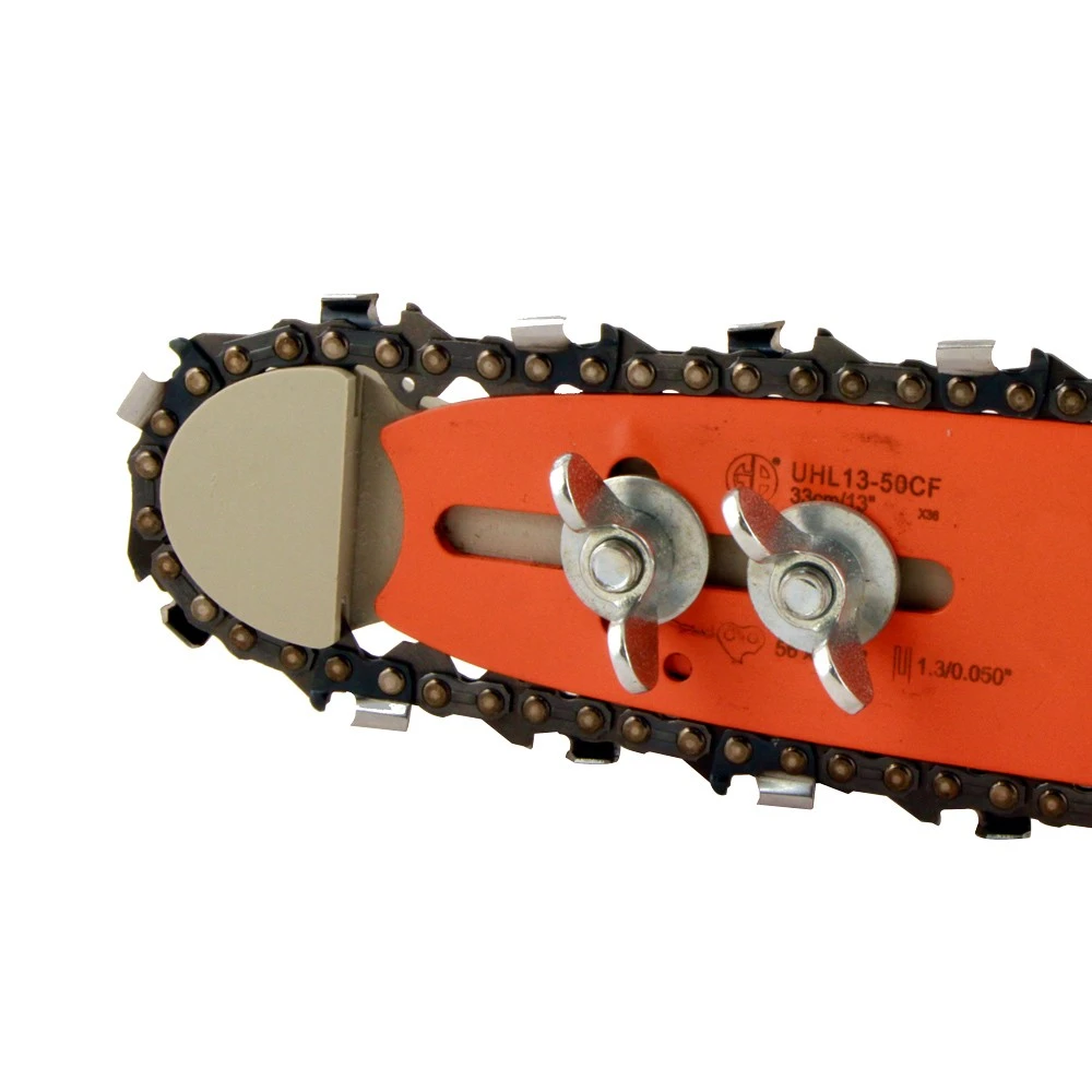 Apulaite mahdollistaa teräketjun teroituksen ilman moottorisahaa. Ketju liukuu apulaitteen urassa, joka helpottaa teroitusta. Kiinnitys laippaan kahdella pultilla. Valmistettu kestävästä muovista.