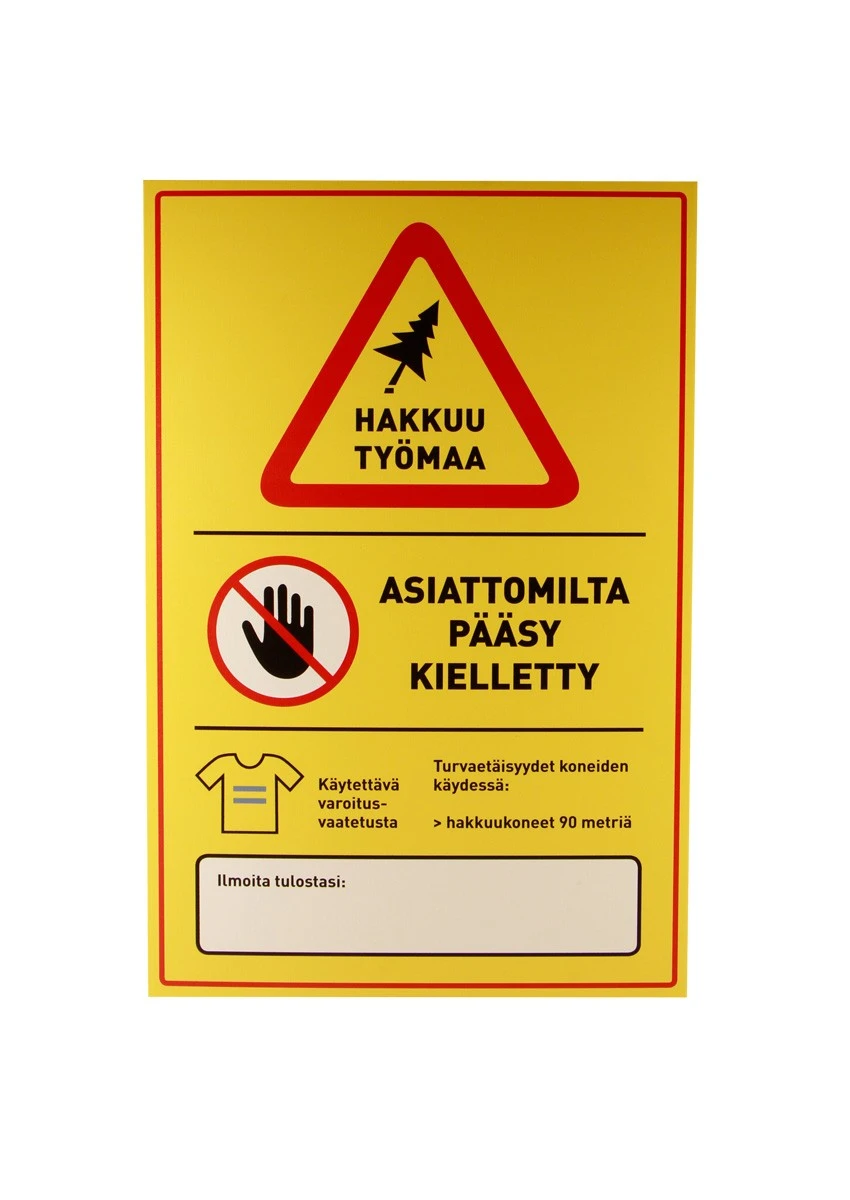 Erittäin kestävä hakkuutyömaakyltti, johon on helppo lisätä omat yhteystiedot. Kennolevyn rakenne kestää hyvin myös pakkaskeleillä.