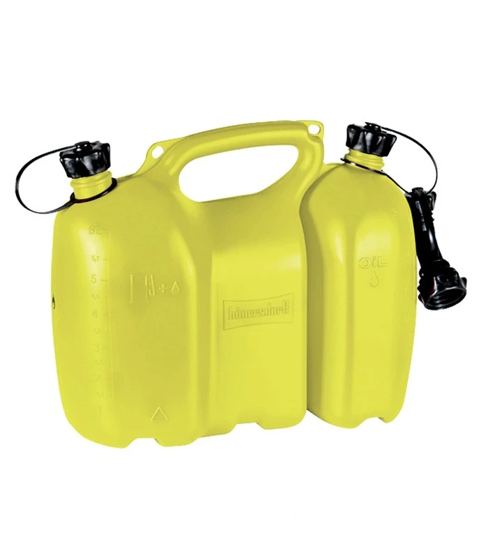 Polyetyleenikannu, jossa 6 litrainen polttoainekannu ja 3 litrainen teräketjuöljysäiliö, jossa kierretulppa. Täyttöputki sisältyy hintaan.