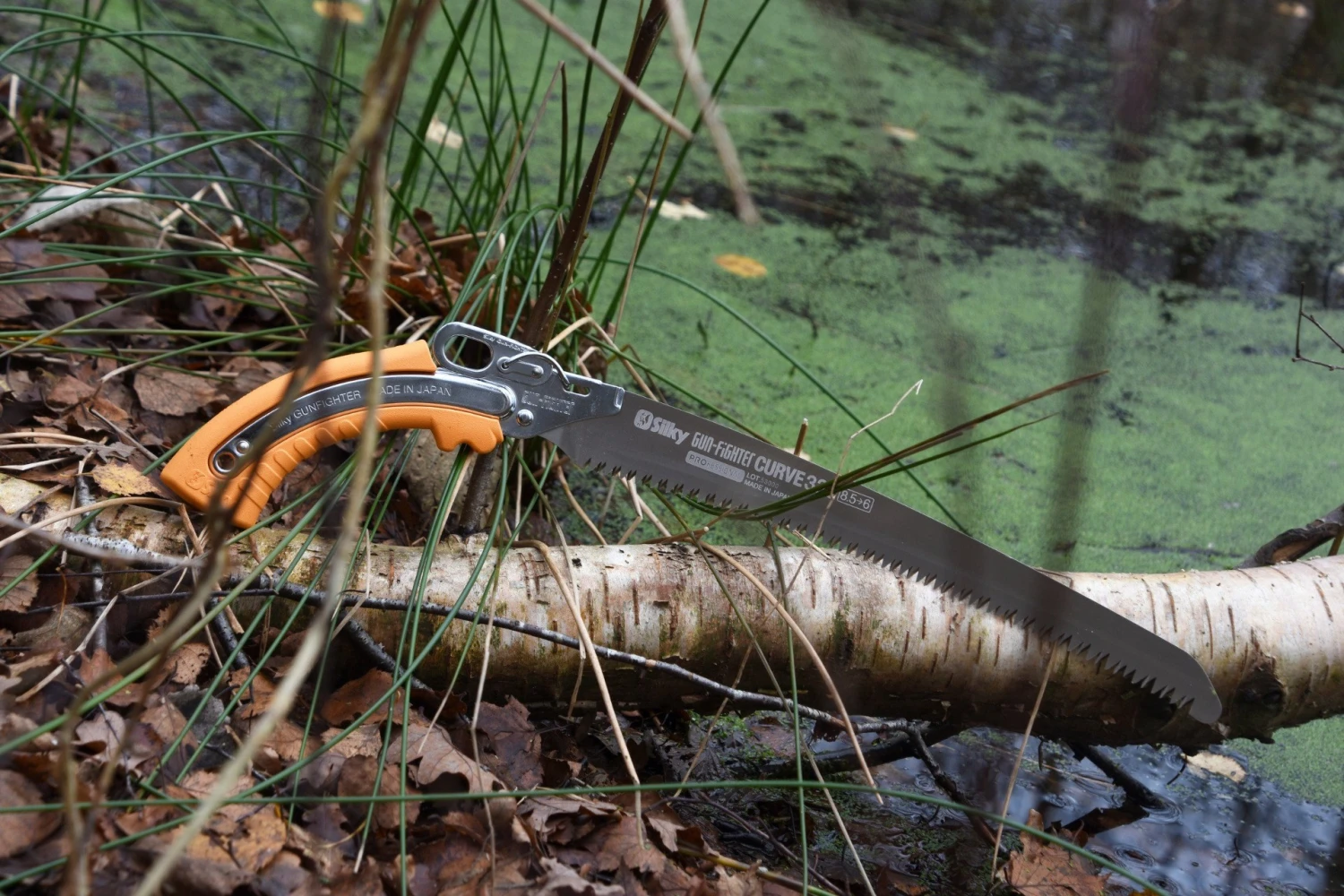 Korkealaatuisesta Japanilaisesta teräksestä valmistettu Gunfighter on tuttua Silky laatua. Saha sopii erityisen hyvin tuoreelle puulle. Sahan offset hammastus (8,5 – 6 hammasta/30mm) tekee sahaamisesta erittäin nopeampaa ja tehokkaampaa. Sahassa on niin kutsuttu Gokai-Me puhdistushammas, joka poistaa tehokkaasti purun sahauksen aikana nopeuttaen sahausta.Sahan tyviosan tiheämpi hammastus tekee myös sahauksen aloittamisesta vaivatonta. Terän pituus 330mm, hampaiden pituus 3,5-5mm ja paino 465g. Terä on helppo ja nopea vaihtaa ilman työkaluja. Sahan mukana toimitetaan kotelo.