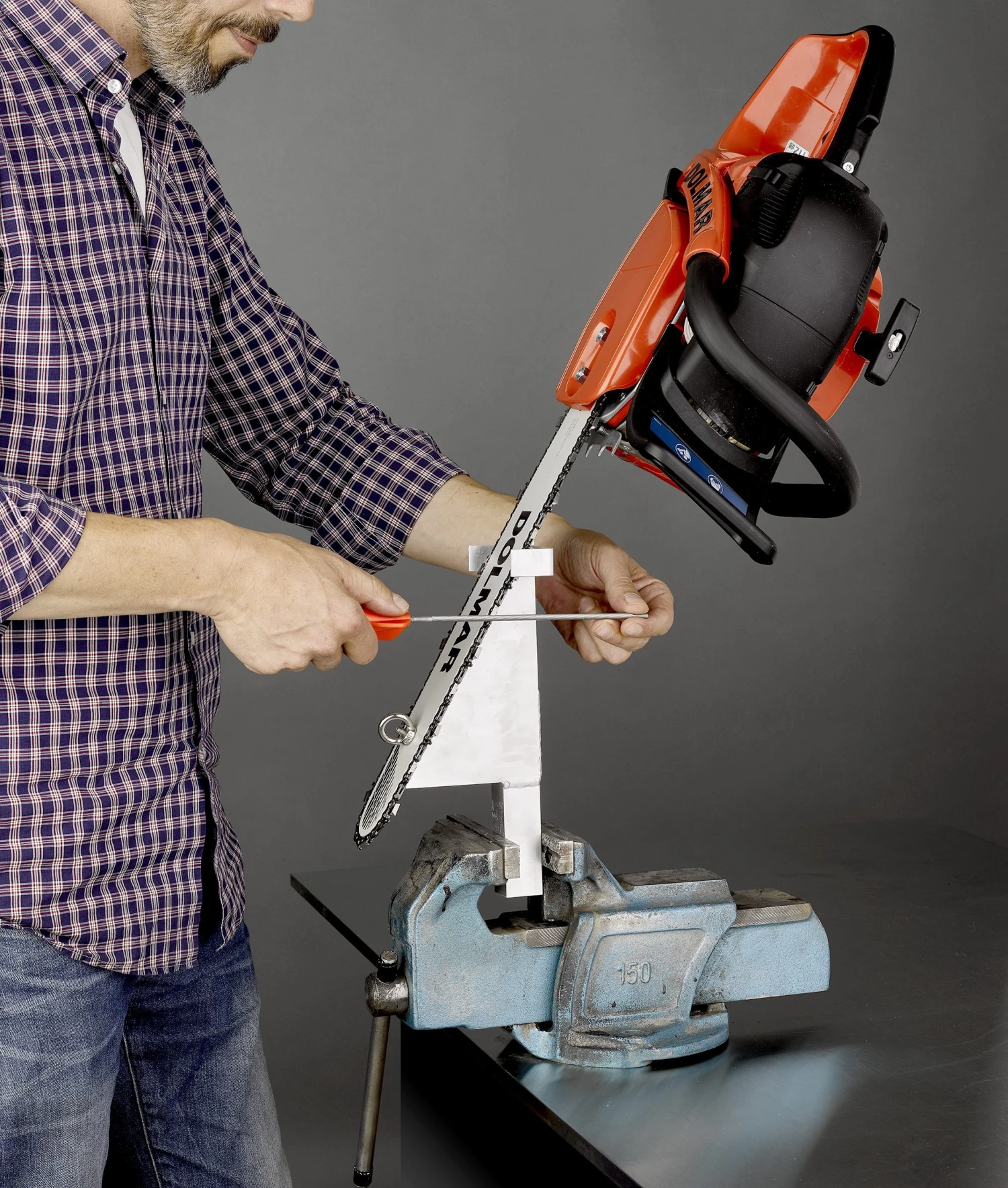 Teroitusteline moottorisahanketjulle. Toisin kuin tavanomainen menetelmä, moottorisaha kiinnitetään pystyasentoon, joilloin ketjun terähampaat kääntyvät vaakatasoon. Vaakatasossa olevien terähampaiden teroitus helpompaa sekä oikea teroituskulma saadaan tarkemmin.
