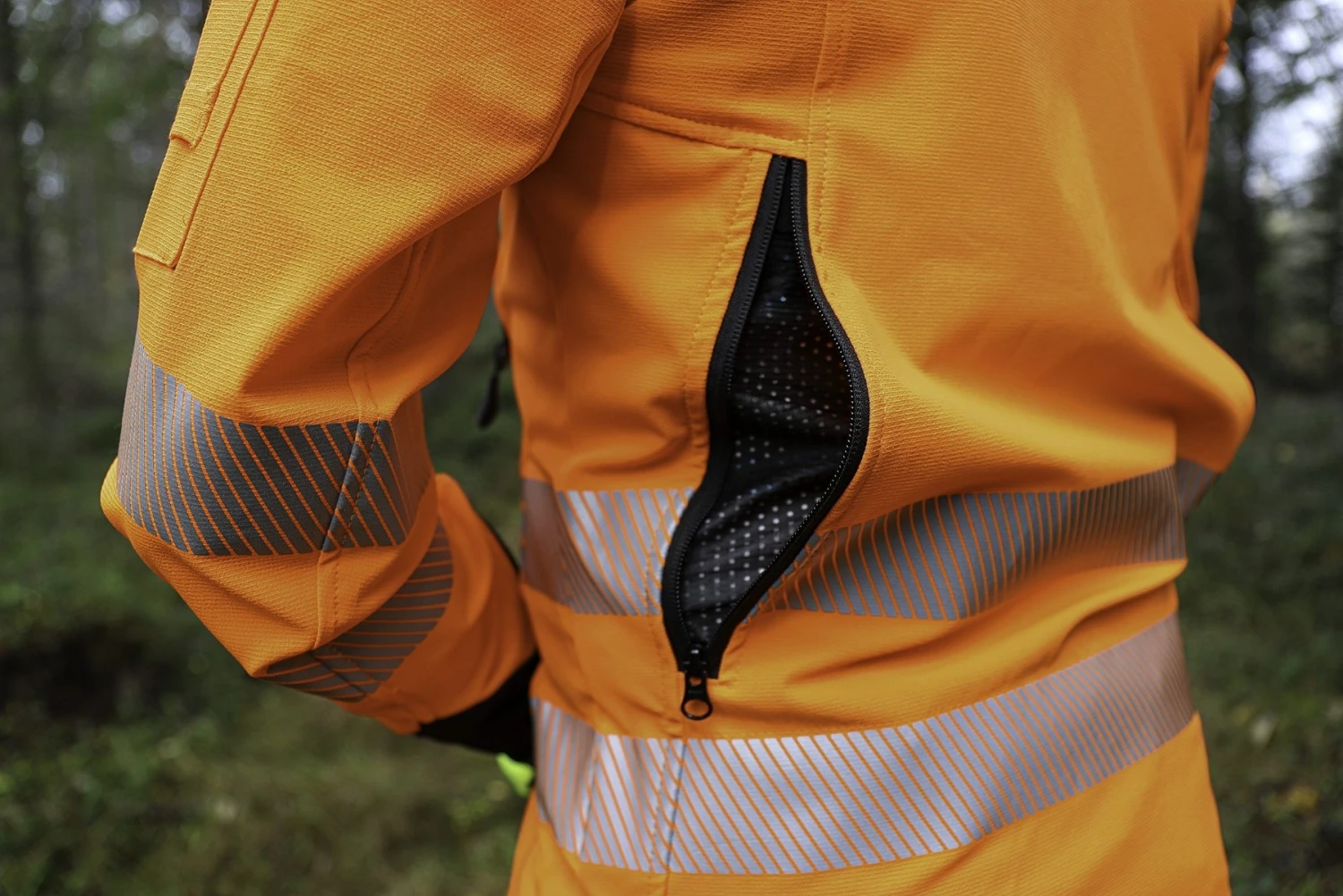 Oranssi Hi-Viz väritys. Leveät heijastinnauhat vyötärössä ja käsivarsissa. Täyttää standardin EN 20471 vaatimukset.