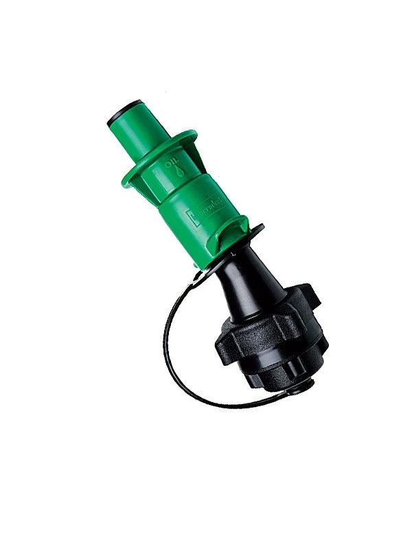 Kätevä täyttöputki teräketjuöljykanistereille. Tankattaessa säiliön täytyttyä, kannun nokassa oleva venttiili sulkeutuu automaattisesti ja kannun nostaminen onnistuu ilman teräketjuöljyn läikkymistä.